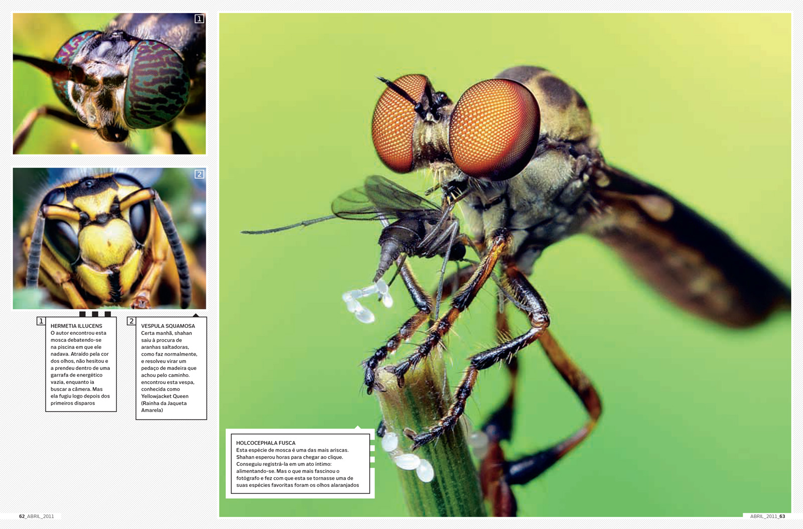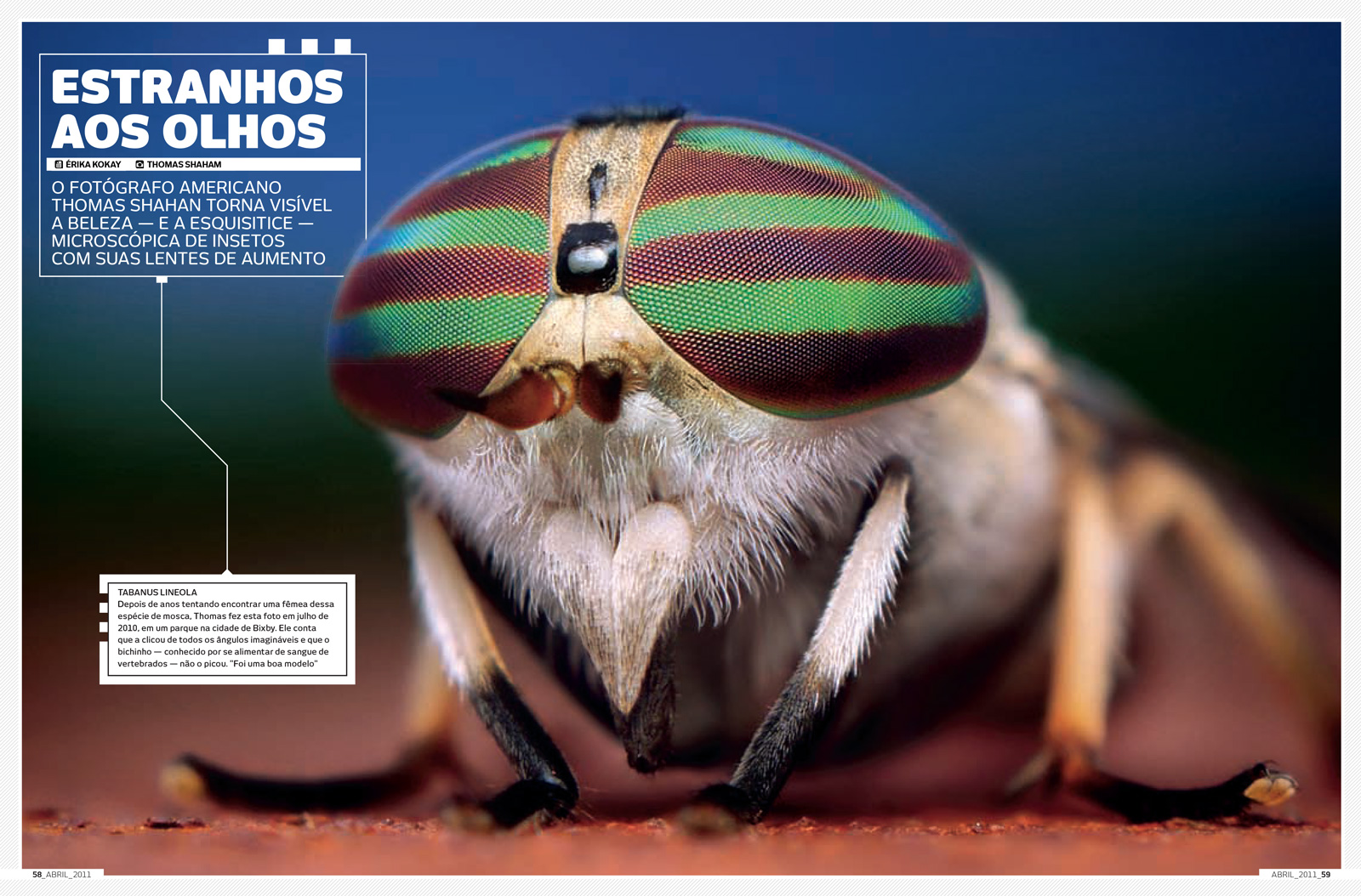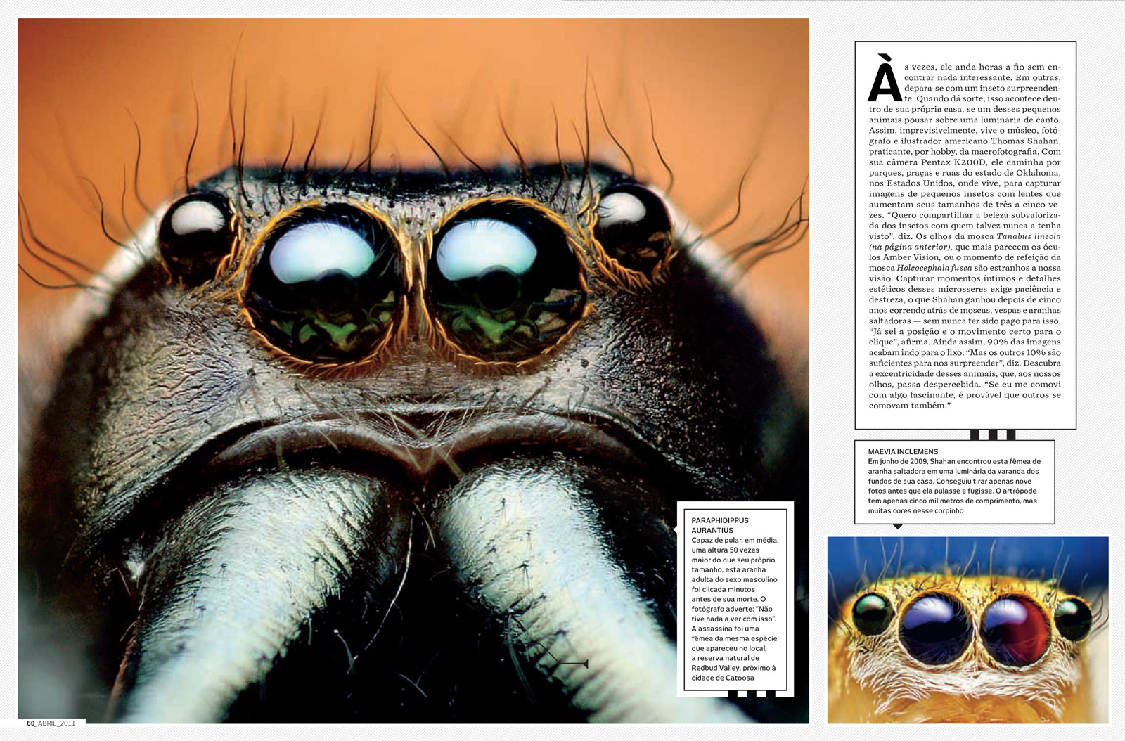 O texto, acompanhado de uma galeria de fotos, expõe o trabalho do fotógrafo americano Thomas Shahan, que pratica a macrofotografia com modelos um tanto excêntricos: os insetos. “Quero compartilhar a beleza subvalorizada dos insetos com quem talvez nunca a tenha visto”, conta Thomas.