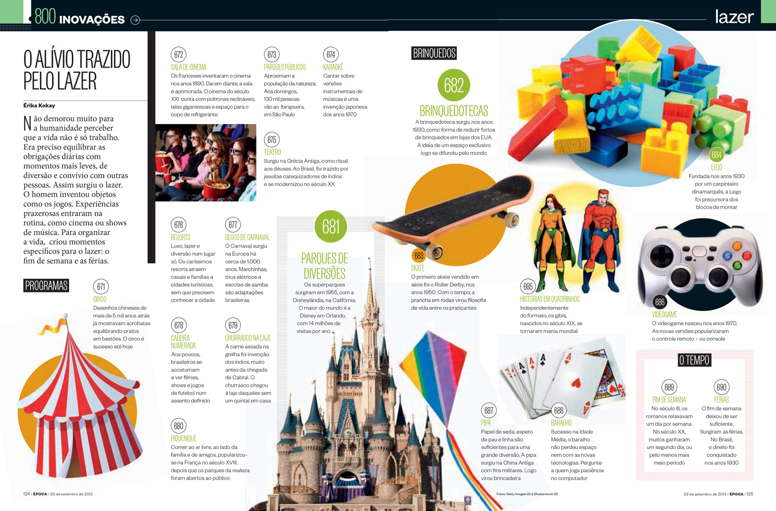 Em edição comemorativa, a revista ÉPOCA enumerou as 800 inovações da humanidade mais significativas de todos os tempos, divididas por áreas. Fiquei responsável por elaborar duas listas, com 20 itens em cada uma, mostrando inovações nas áreas de internet e de lazer.
