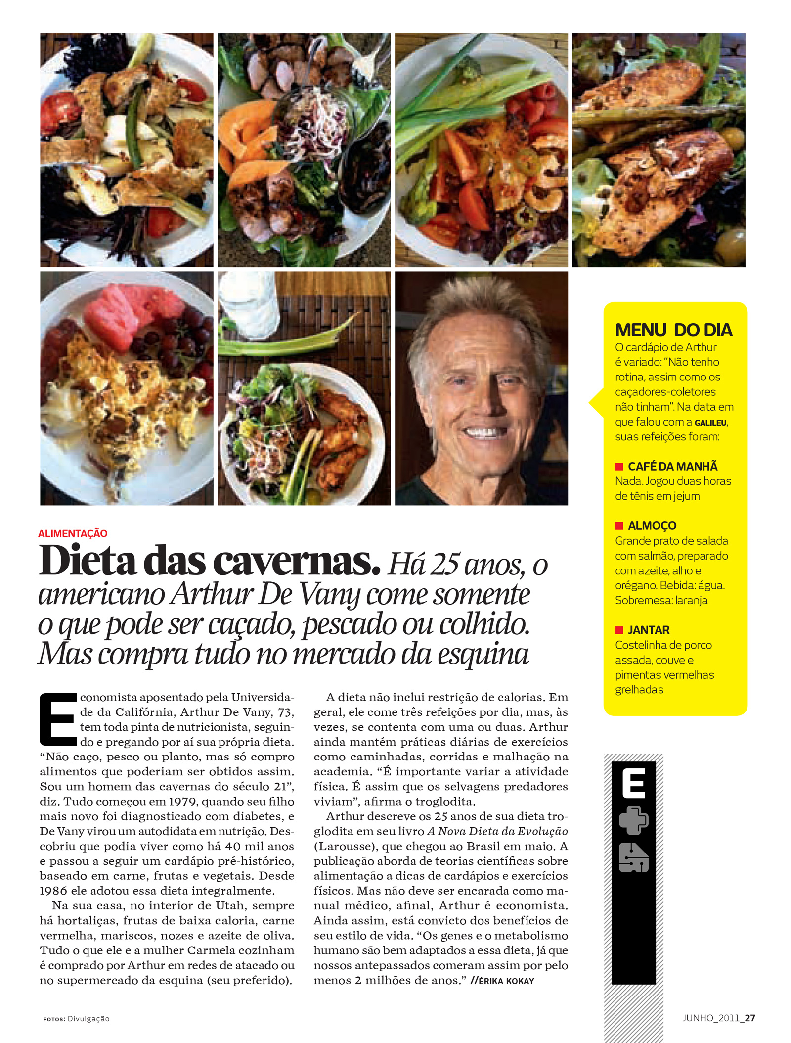 O americano Arthur De Vany só come o que pode ser plantado, caçado ou pescado. Lançou o livro “A Nova Dieta da Evolução” para descrever sua dieta de homem das cavernas. Na época, ele me confessou que compra tudo no mercado da esquina.