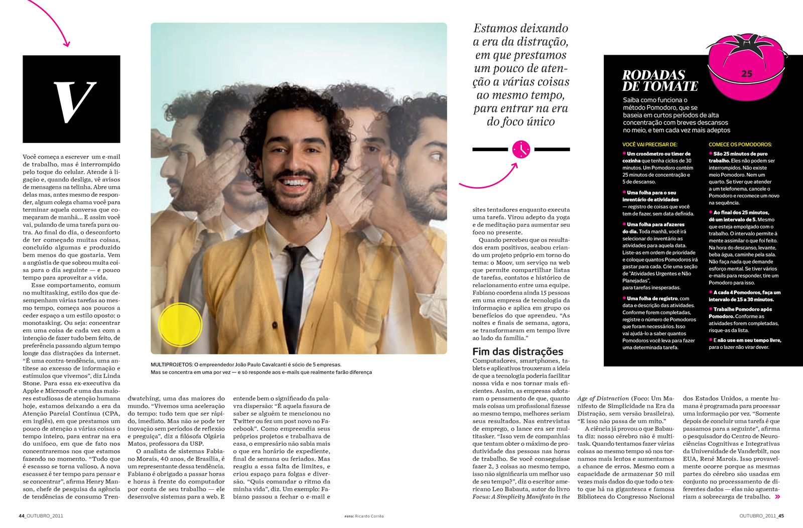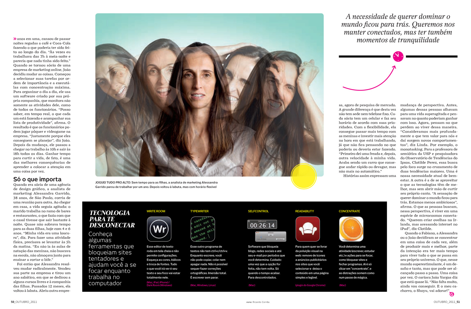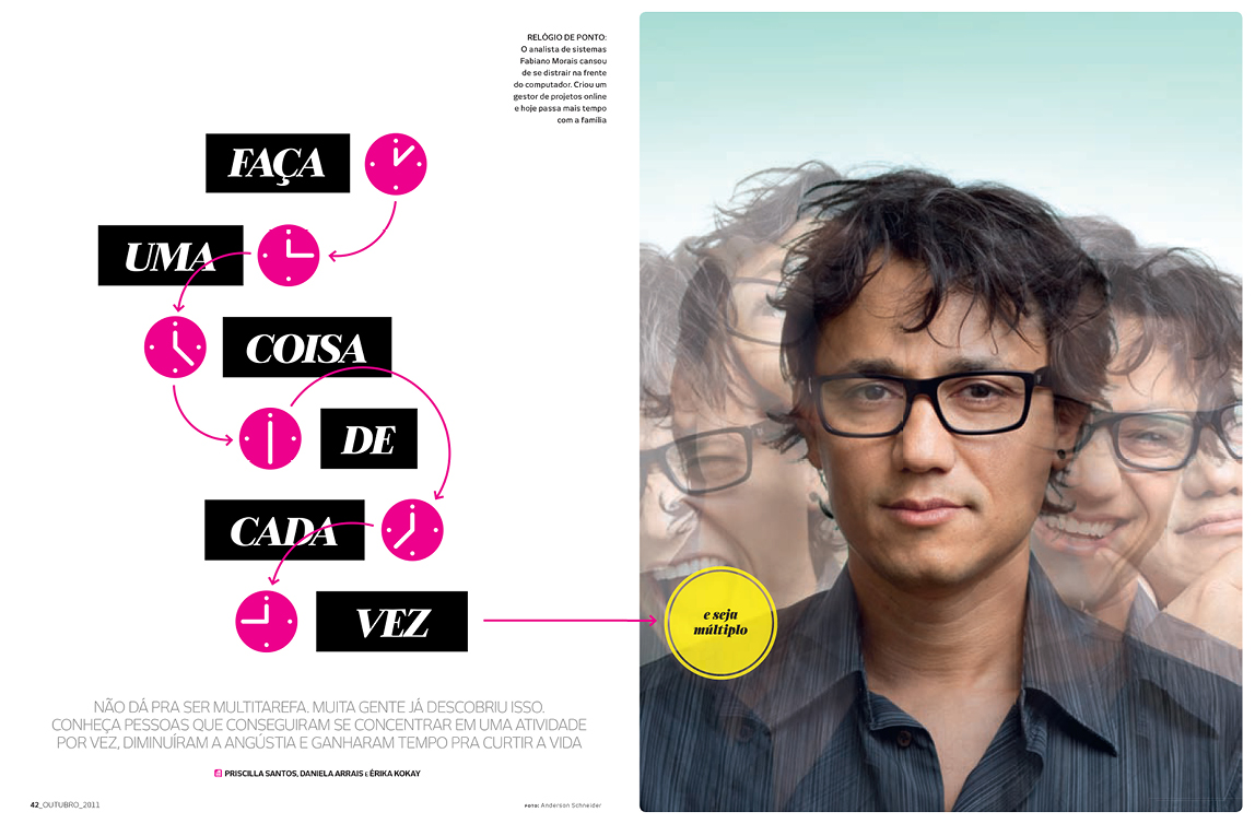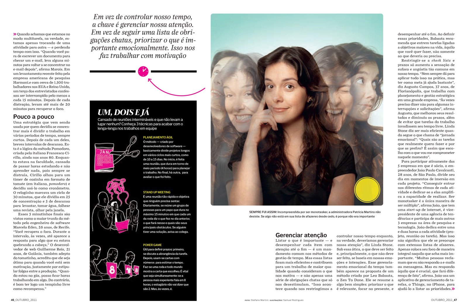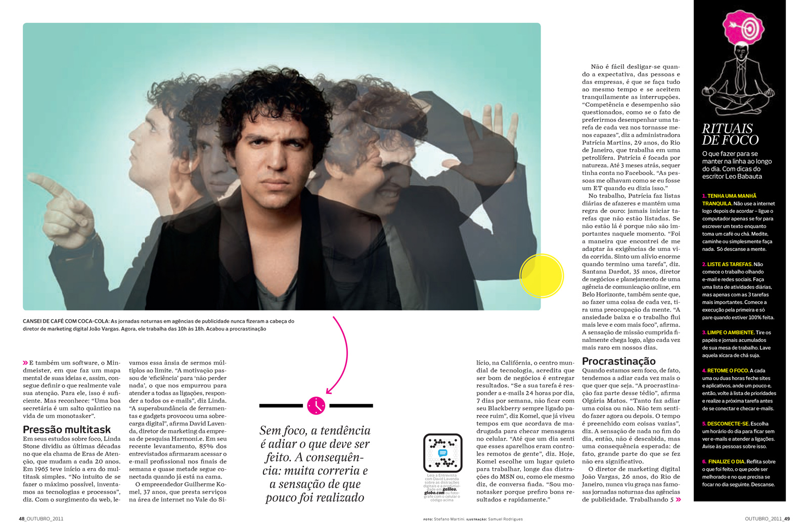 Buscando personagens para uma reportagem da revista GALILEU, conheci um garoto que era, na verdade, o oposto de quem eu estava procurando, mas que me deu ideia para outra reportagem. Ele se autointitulava “monotasking”, ou seja, alguém que fazia uma coisa de cada vez e, por isso, seu tempo acabava rendendo muito mais. Eu, Priscila Santos e Daniela Arrais vasculhamos o universo dessas pessoas, e a reportagem foi capa da GALILEU em outubro de 2011.