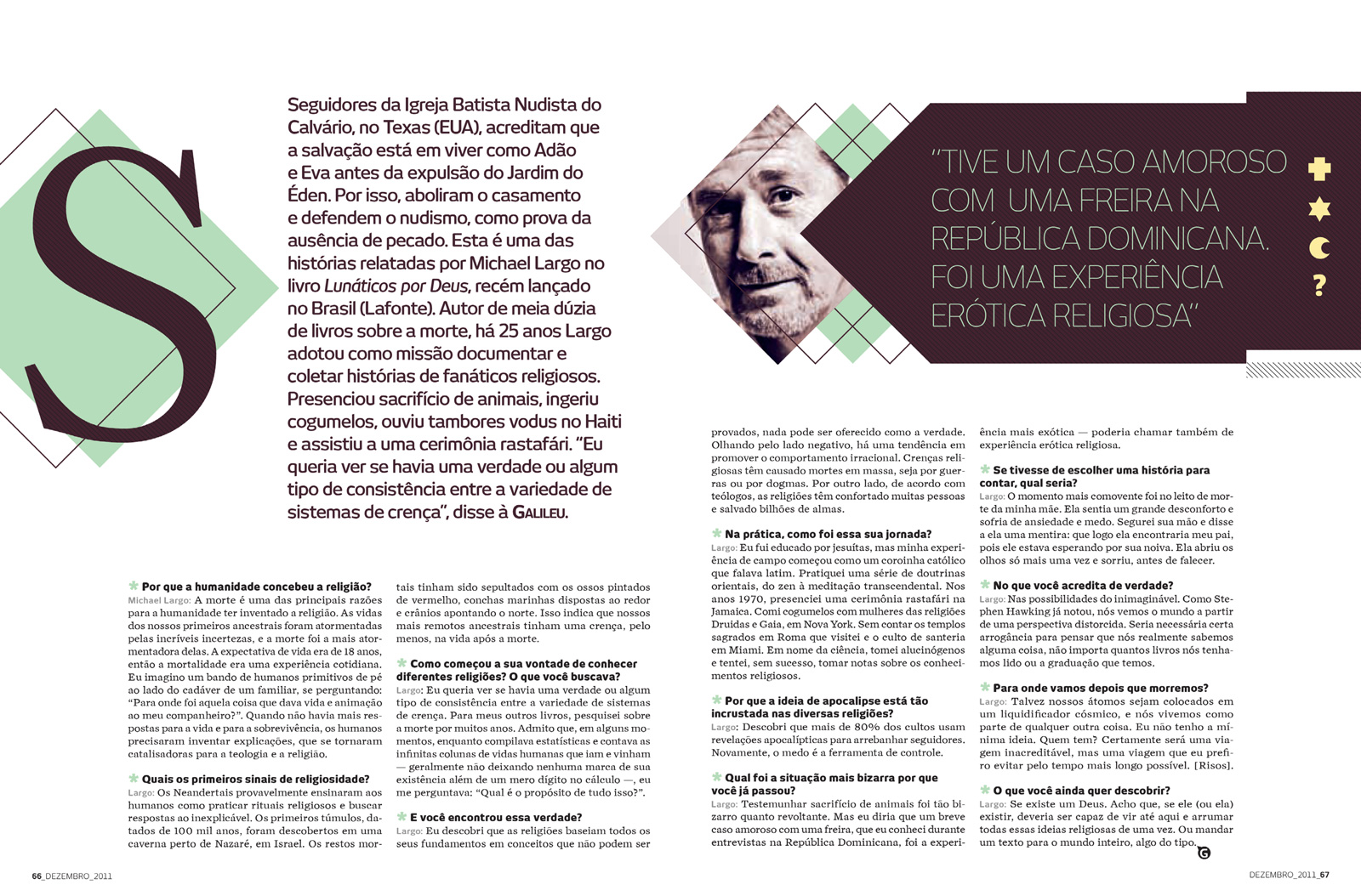 Entrevista com o escritor americano Michael Largo, que passou 25 anos de sua vida conhecendo as mais diferentes práticas religiosas. Comeu cogumelos, presenciou sacrifício de animais, teve um caso com uma freira… E não descobriu se Deus existe.