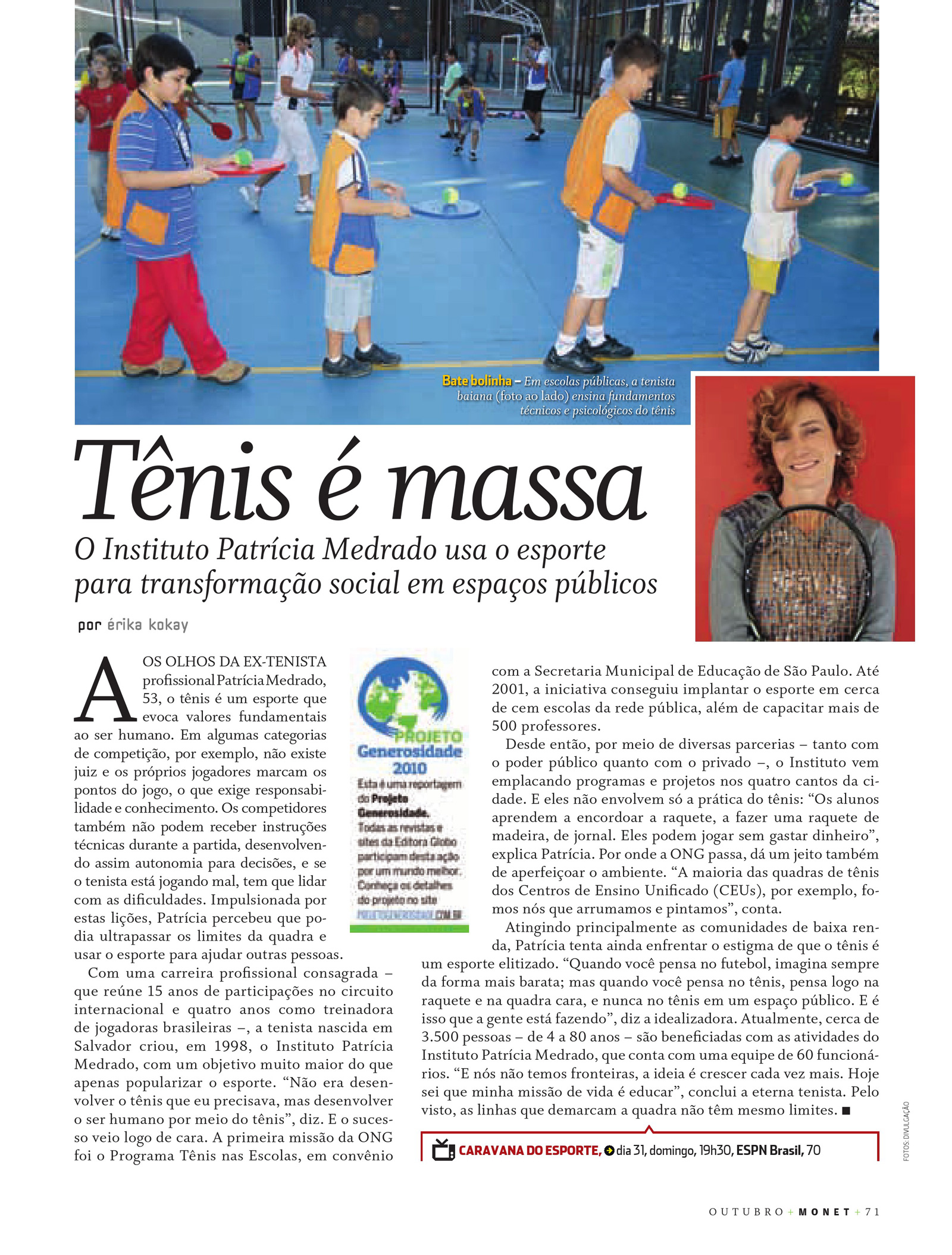 O instituto da ex-tenista profissional Patrícia Medrado usa o esporte para a transformação social em espaços públicos. “Não era desenvolver o tênis que eu precisava, mas desenvolver o ser humano por meio do tênis”, diz ela. Reportagem fez parte do Projeto Generosidade da Editora Globo.